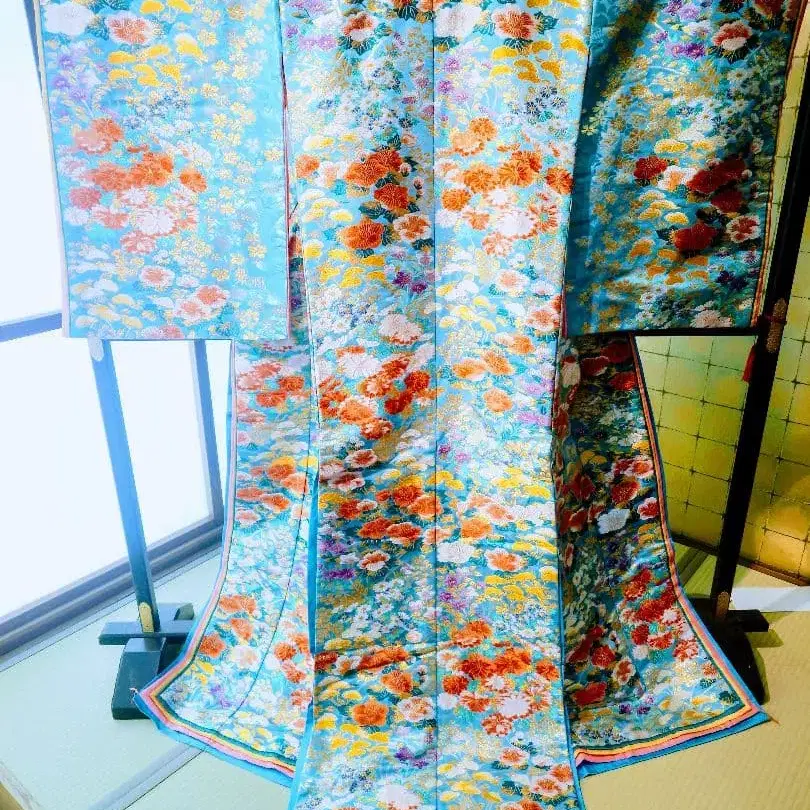 파란색 꽃무늬 기모노 실크제 자수 포함