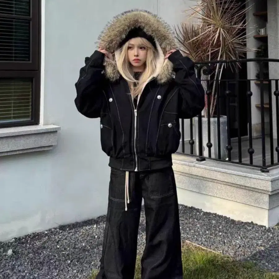 • 퍼 후드 블랙 짧은 기장 다운 자켓 y2k 그런지