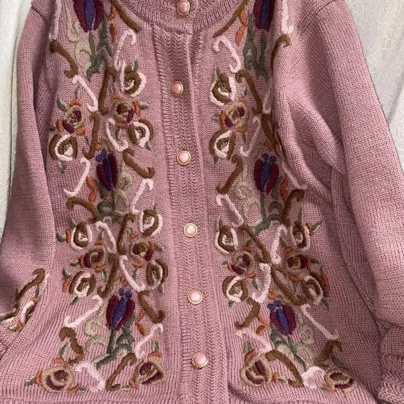 빈티지 자수 가디건 니트 자켓 핑크 꽃무늬 레트로 쇼와