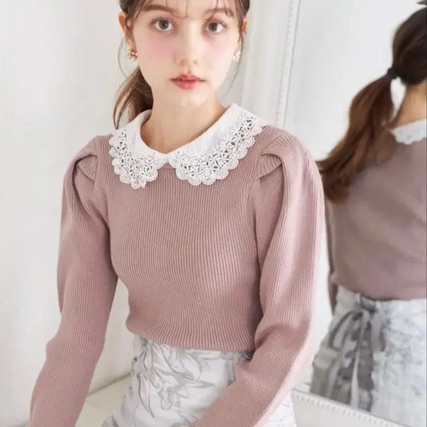 2WAY 비쥬 레이스 카라 부착 리브 니트 풀오버 [lorelei] tocco closet(토코 클로젯) 모카 핑크 상품번호: 186-191561