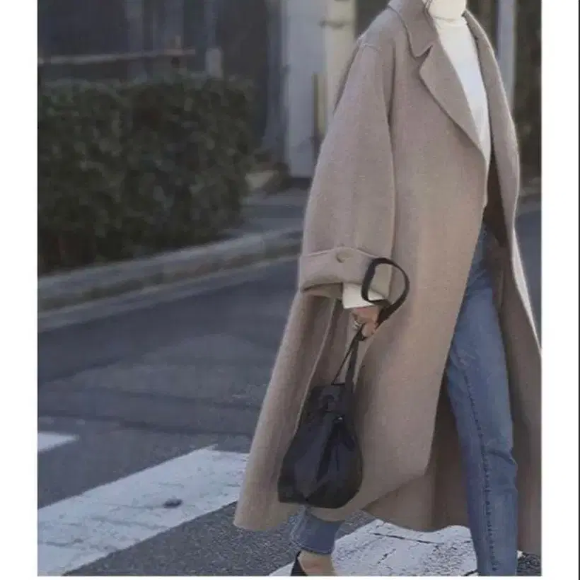 여유로운 실루엣의 울 100% 롱 코트입니다. 색상은 밀크티 같은 베이지입니다.