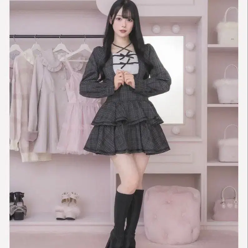 Pium 크로스 테이프 바이컬러 티어드 원피스