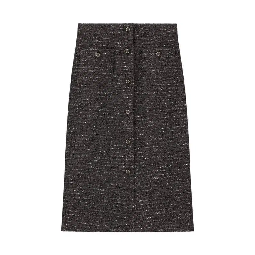 니트 트위드 소재의 깊이 있는 표정이 겨울 의상을 은근하게 격상시켜 주는 타이트 스커트입니다. 차콜 베이스에 화이트 실을 섞어 짠 입체감 있는 원단은 깊이 있는 시크한 무드를 풍기면서도 부드러운 여성스러움을 연출합니다. 프론트에 나란히 달린 디자인 버튼이 악센트가 되어, 심플한 상의와 함께 입기만 해도 엘레강트한 스타일이 완성되는 아이템입니다. 신체 라인을 너무 드러내지 않는 절묘한 타이트 실루엣이 품격 있는 세로 밸런스를 만들어내며, 일상부터 특별한 날까지 활약합니다. 단추 디자인이지만 밑단 부분은 박혀 있어 움직여도 품격 있게 보여줍니다. 온의 장면에서는 컴팩트한 니트나 블라우스를 맞춰 클래식한 출퇴근 스타일에. 자켓을 걸치면 더욱 단정한 인상을 완성할 수 있습니다. 오프의 날에는 포근한 니트나 가디건과 함께 트위드의 화려함을 돋보이게 하는 성숙 캐주얼로. 부츠를 매치하면 계절감을 담은 세련된 스타일이 완성됩니다. 한 장으로 코디네이트의 주인공이 되는, 겨울 옷장에 추가하고 싶은 고급 스커트입니다. 34 사이즈 허리 64cm 힙 91.9cm 스커트 길이 68cm 이번 시즌 상품입니다. 엠프리미어 어반 리서치 에포카 에스트네이션 아나이 로페