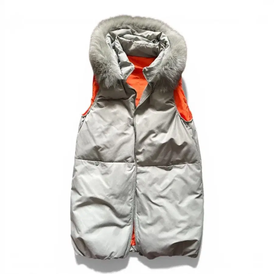 카키와 오렌지 배색이 눈길을 끄는, 후드 부착 다운 베스트입니다.
