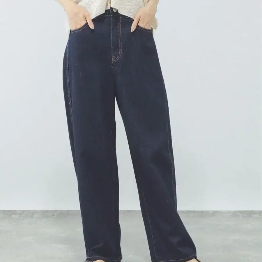 허벅지~무릎까지는 너무 퍼지지 않는 적당한 여유, 거기서 밑단으로 향해 완만하게 커브시켜 적당히 루즈한 실루엣으로.