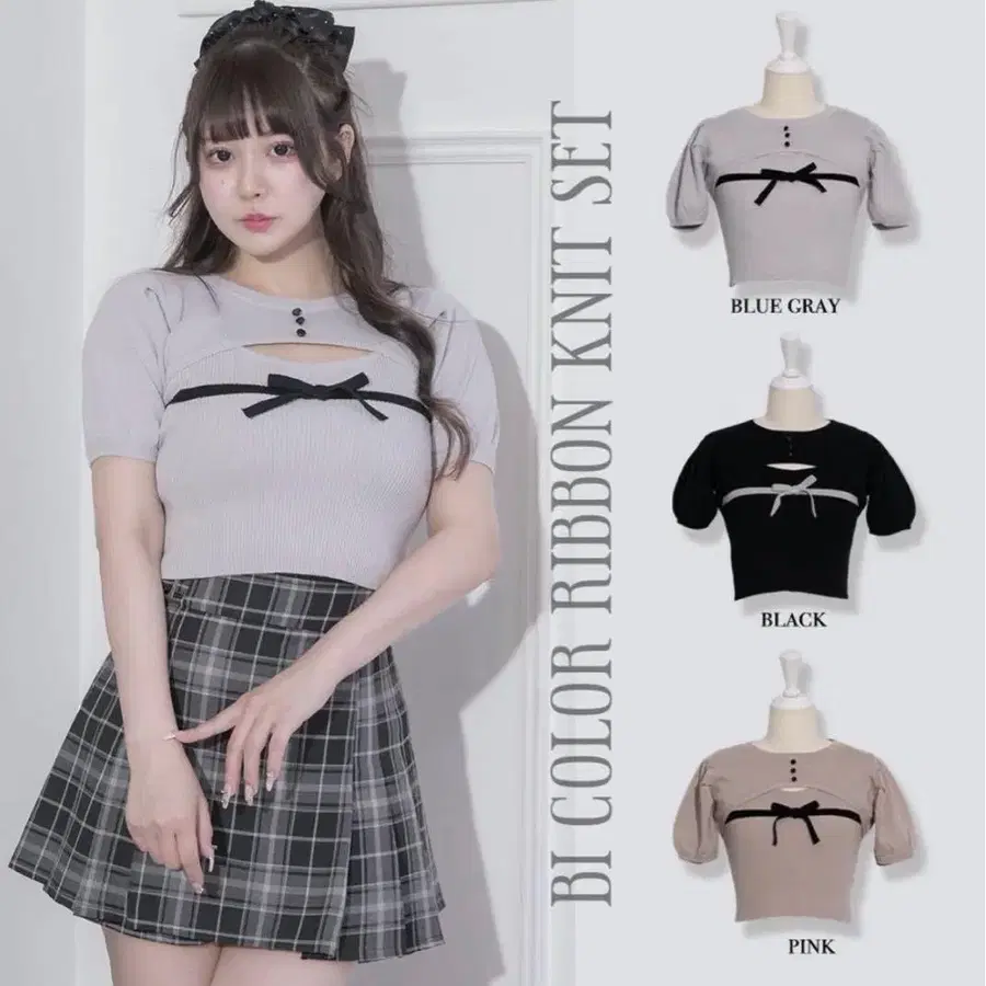 바이컬러 리본 니트 세트 pium 블루 그레이