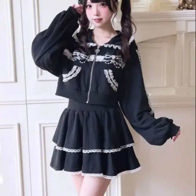 NoGenki 레이스 저리 셋업 후드티 스커트 M 사이즈 블랙