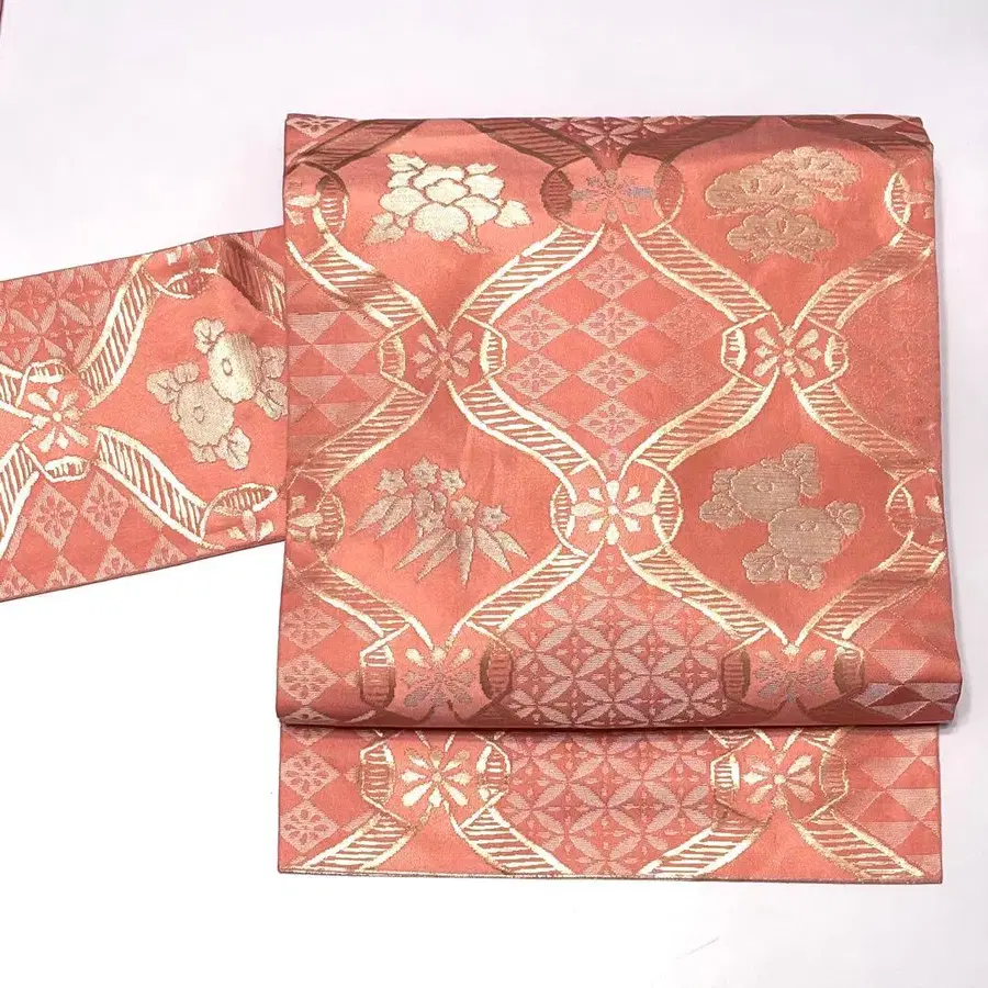 자동 번역되었어요. 원문보기카와시마 직물제. 사랑스러운 핑크색에 금색 무늬가 장식된, 고급스럽고 화려한 인상의 나고야 오비입니다.