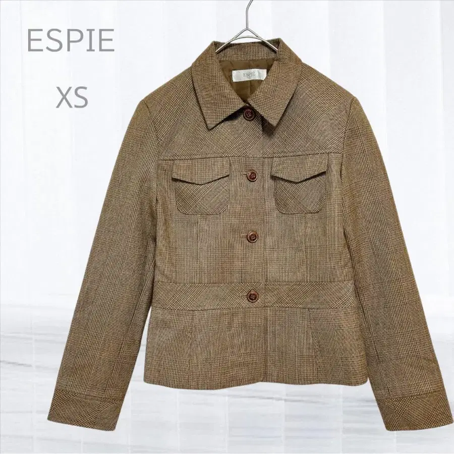 브라운 계열의 체크 무늬 테일러드 자켓, 프론트 포켓 부착.
