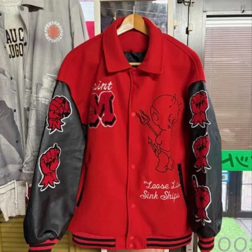 데빌 테드맨 바시티 자켓 레드 x 블랙 스타디움 자켓 자수 saint