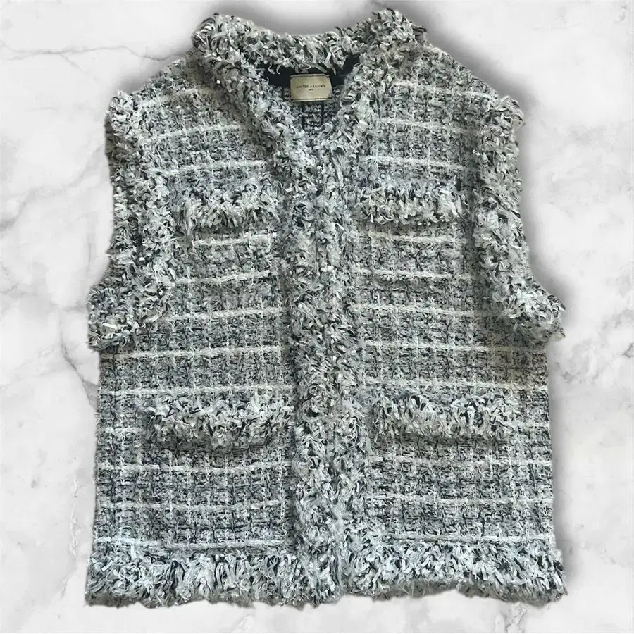 입체감 있는 프린지를 넥라인, 암홀, 포켓 입구에 사용하여 화려함을 더한 니트 트위드 베스트입니다.