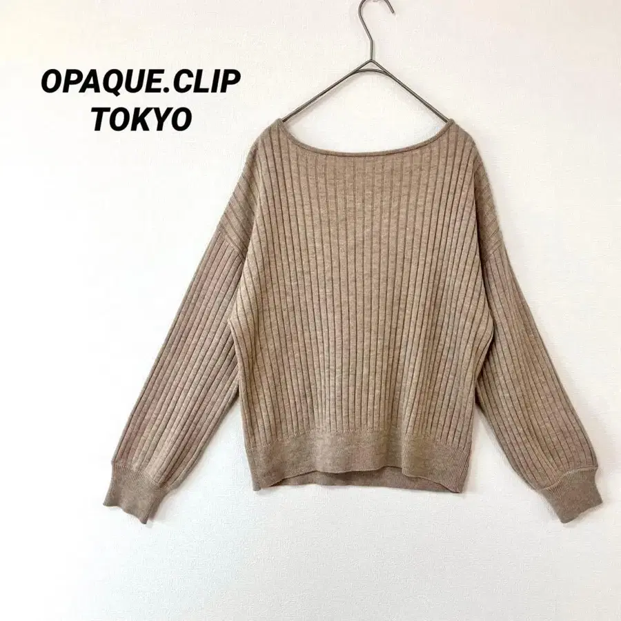리브 편직의 베이지 니트, 드롭 숄더와 보트넥 디자인.