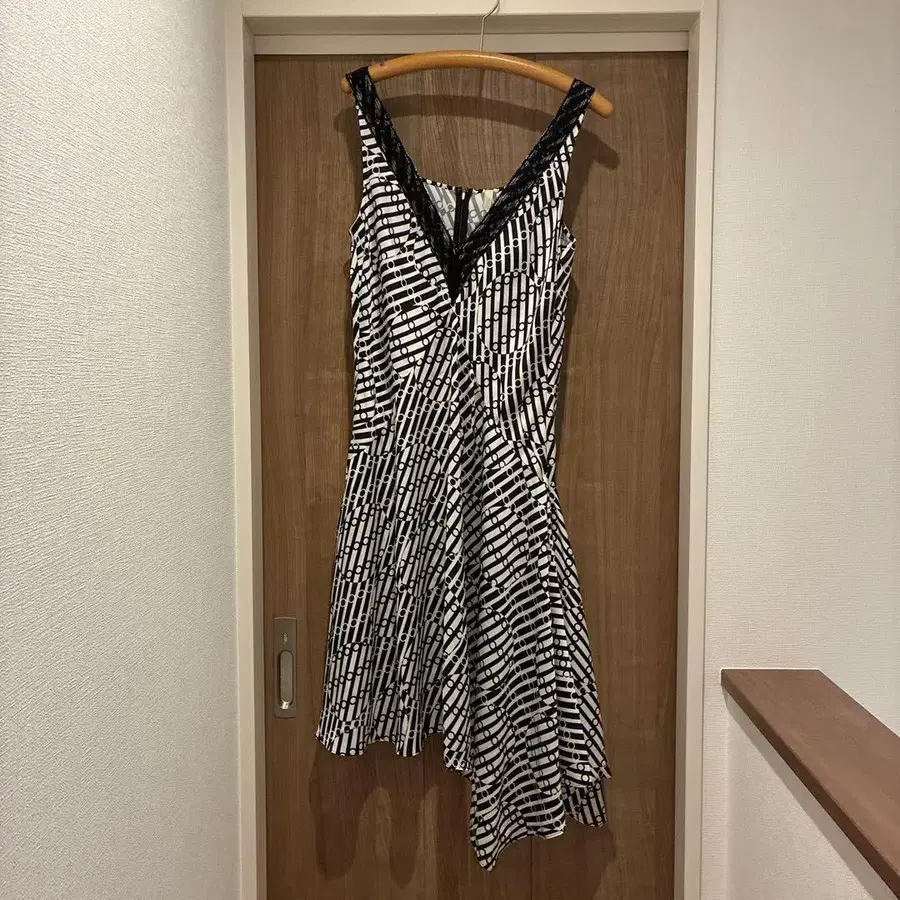 화이트 블랙 스트라이프 도트 슬리브리스 원피스