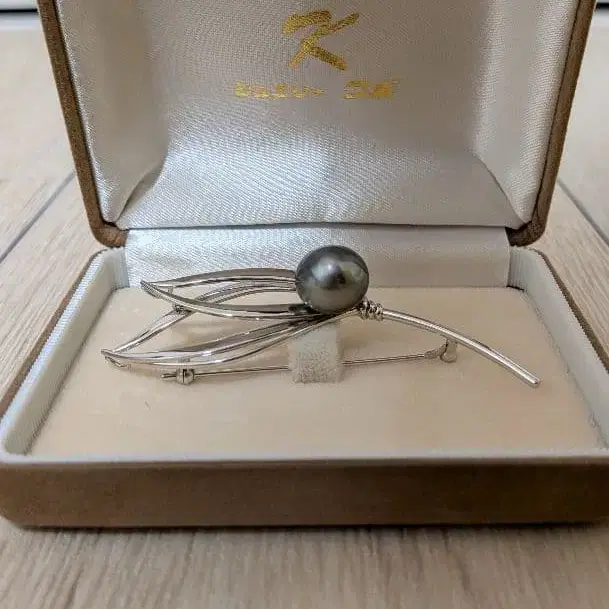 실버 리프 모티브 그레이 펄 브로치 코사지