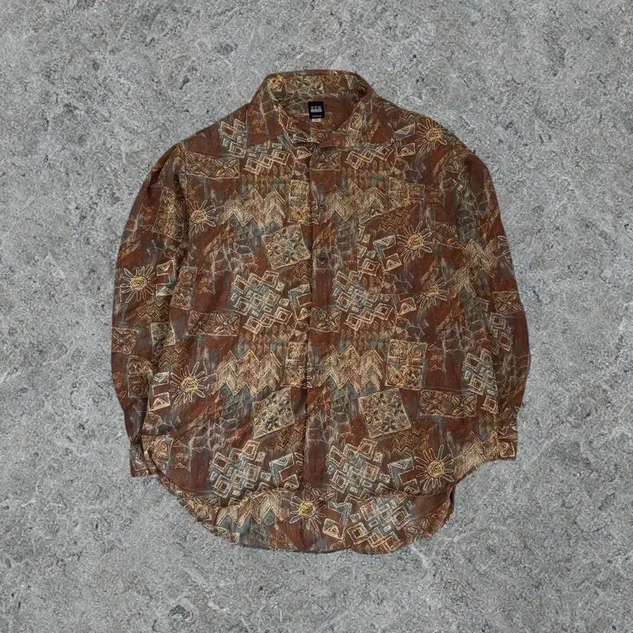 올 패턴 에스닉 시어 셔츠 브라운 오버 사이즈 긴팔 캐주얼