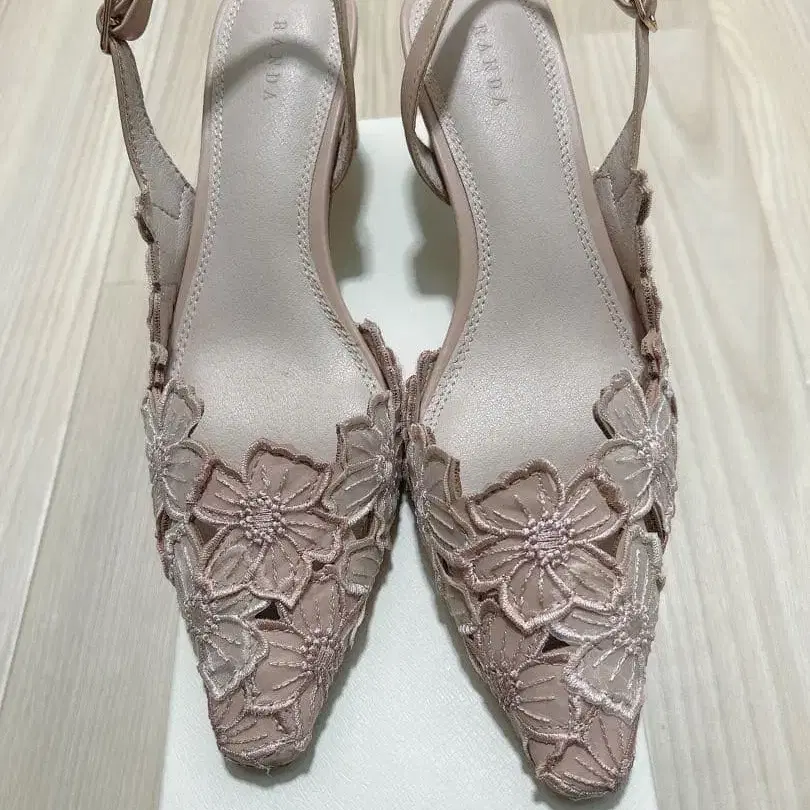 RANDA 핑크 꽃무늬 자수 슬링백 펌프스
