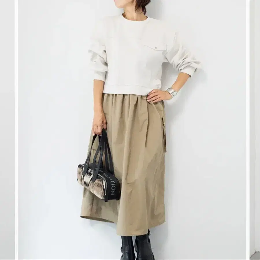맨투맨 상의와 나일론 느낌의 스커트를 조합한 이소재 도킹 원피스입니다. 2025년 12월 OTO.HA 공식 온라인 샵에서 예약 구매했습니다. 기대했던 의류인데, 시착해 보니 저에게는 도저히 어울리지 않아 깨끗한 상태일 때 필요하신 분께 양도해 드리고 싶어 판매합니다. 미사용 새상품으로 표기했지만, 시착을 위해 한 번 집 안에서 입어보았습니다. 착용하고 외출하지는 않았습니다. 캐주얼한 착용감이지만, 광택 있는 소재감이 성숙한 고급스러움을 표현해 줍니다. 허리 부분과 스커트는 연결되어 있지만, 자연스러운 절개로 마치 따로 입은 것처럼 보입니다. 이하, 공식 샵에서 일부 발췌한 정보입니다. 색상: 에크루 소재: (본체) 겉감: 면 75% 폴리에스테르 25% 안감: 폴리에스테르 95% 폴리우레탄 5% (별도 천) 나일론 100% 세탁기로 약하게 세탁 처리 가능합니다. 상의 기장 48cm 총길이 123cm 가슴 너비 51cm 어깨 너비 52cm 소매 끝 너비 11/10.5cm 소매 길이 52cm 상의 밑단 폭 51cm 스커트 밑단 폭 92cm 모델 신장: 166cm 집 옷장 안에 보관하고 있습니다. 개나 고양이 등 반려동물이나 흡연자는 없습니다. 시착을 위해 한 번 입어보았습니다. 미리 양해해 주실 분만 구매해 주시기 바랍니다. 필요하신 분께 닿기를 바랍니다 - !
