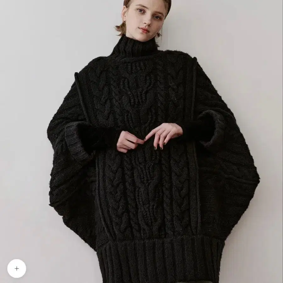 얼굴 주변은 두꺼운 리브 짜임의 와이드 터틀넥.