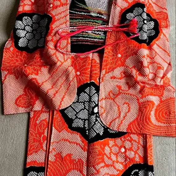 후리소데 오렌지와 블랙 꽃무늬 총시보리