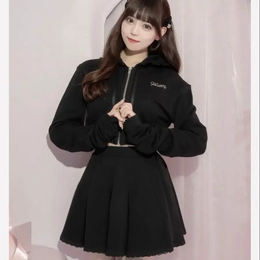 레이스 프릴 후드티 x 플리츠 스커트 세트