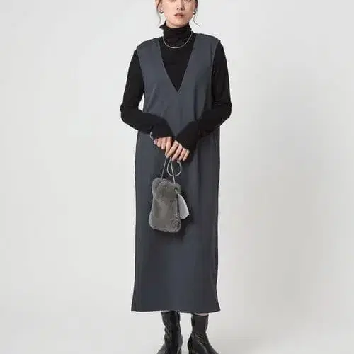 그레이 블랙 V넥 니트 롱 드레스