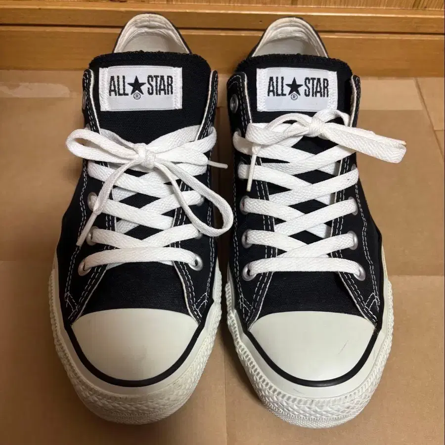 캔버스 소재의 블랙 로우컷 스니커즈. - 브랜드: CONVERSE - 모델: ALL STAR - 컬러: 블랙 - 디자인: 로우컷 - 소재: 캔버스 방문해 주셔서 감사합니다. 사용에 따른 스크래치 등은 있지만, 아직 착용 가능합니다. 착용 기회가 없어 판매합니다. 잘 부탁드립니다. 메인 컬러: 블랙 사이즈: 26.5cm