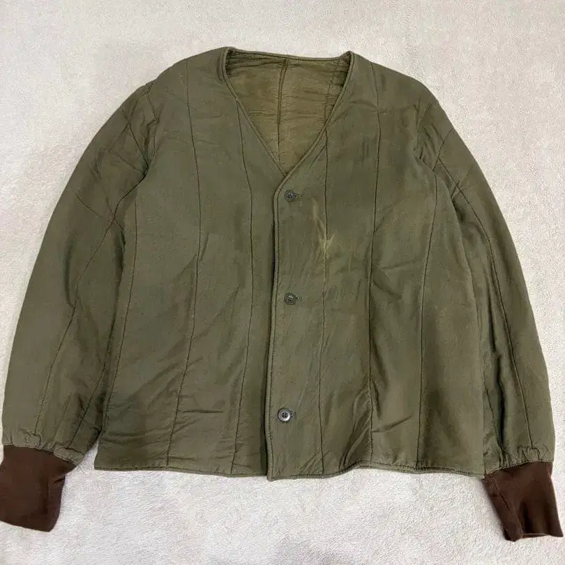 사이즈 기재 없음 L 상당 어깨 너비 49 소매 길이 66 가슴 너비 55 기장 68 앞쪽에 색빠짐 있음 올리브 그린 카키 V넥 퀼팅 빈티지 군용품 1649