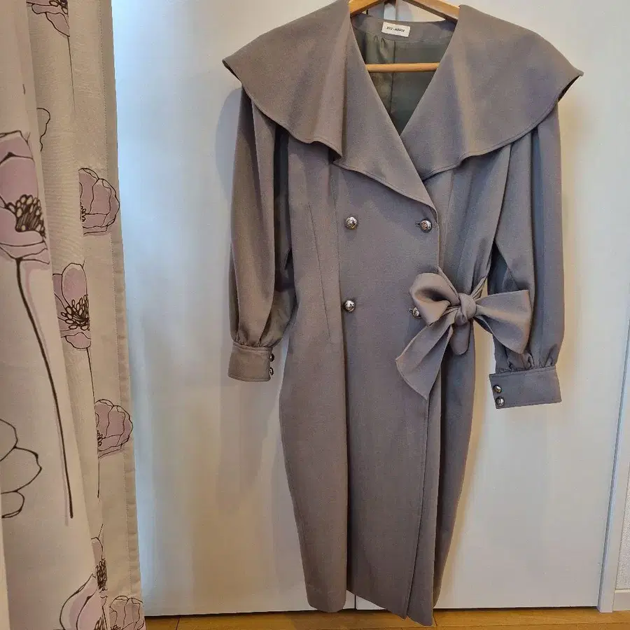 큰 옷깃과 리본이 특징인 그레이 색상의 더블 브레스트 원피스. - 색상: 그레이 - 디자인: 더블 브레스트 - 특징: 큰 옷깃 - 장식: 리본 포함 - 소매: 긴팔 클리닝을 마쳤습니다. 가격 인하는 어렵습니다.