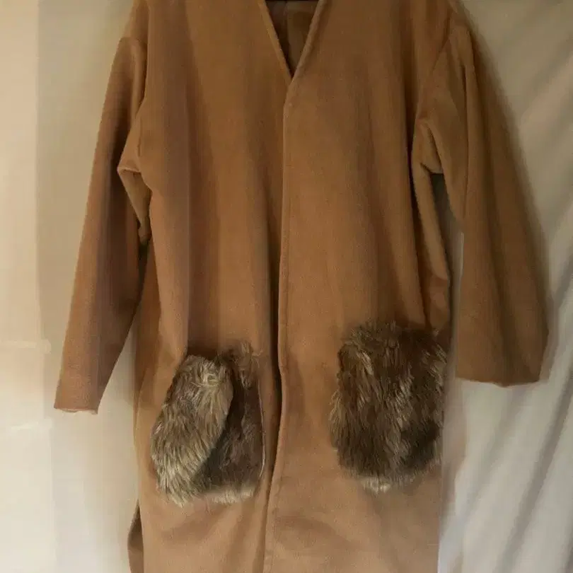 베이지 퍼 부착 롱 코트