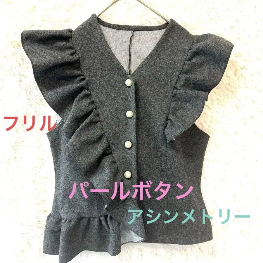 정말 귀여운 펄 버튼과 프릴의 비대칭 그레이 V넥 베스트
