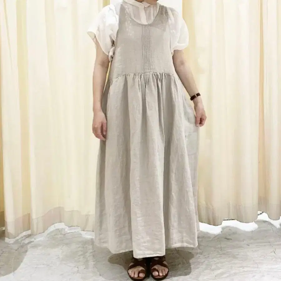 츠하루 사만사 모스모스 린넨 앞뒤 착용 에이프런 원피스 베이지