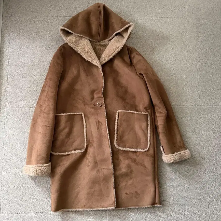 새상품급 시마무라 여성용 카멜 베이지 후드 부착 무스탕 코트