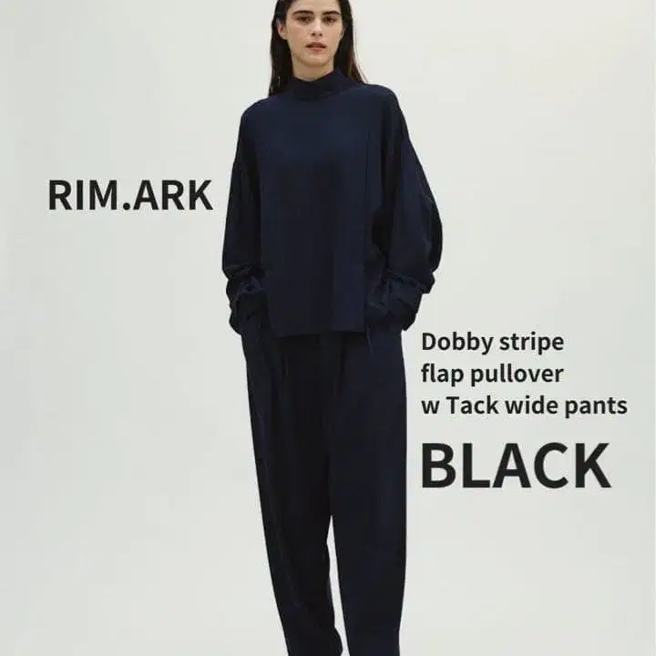 실루엣은 RIM.ARK 스테디셀러인 [ W tuck wide PT ]의 형태를 채용하여 깊은 턱이 허리 둘레를 커버하면서도 아름다운 와이드 실루엣을 그립니다. (공식 인용)