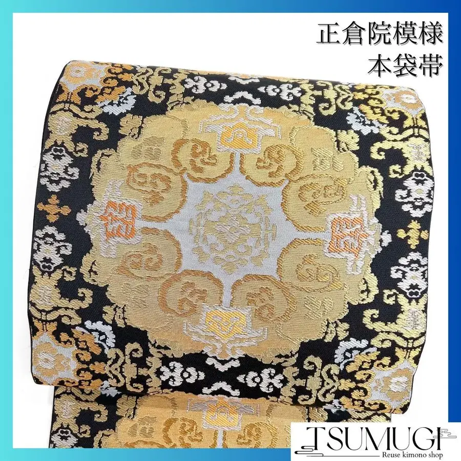 블랙 베이스에 쇼소인 문양이 짜인 후쿠로 오비입니다.