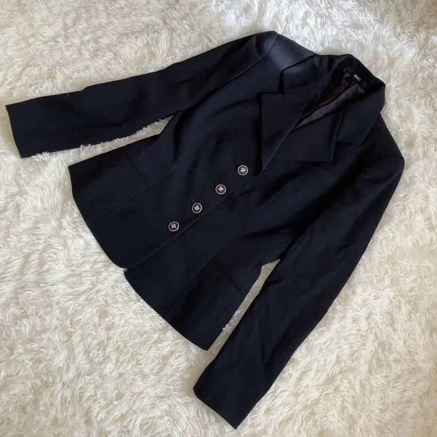 베이직한 블랙 자켓이지만, 실버 테두리가 있는 로고 버튼이 악센트가 되어 고급스러움을 더합니다. 실루엣이 매우 예뻐서 격식 있는 자리나 일상복으로도 오래 입으실 수 있는 아이템입니다.