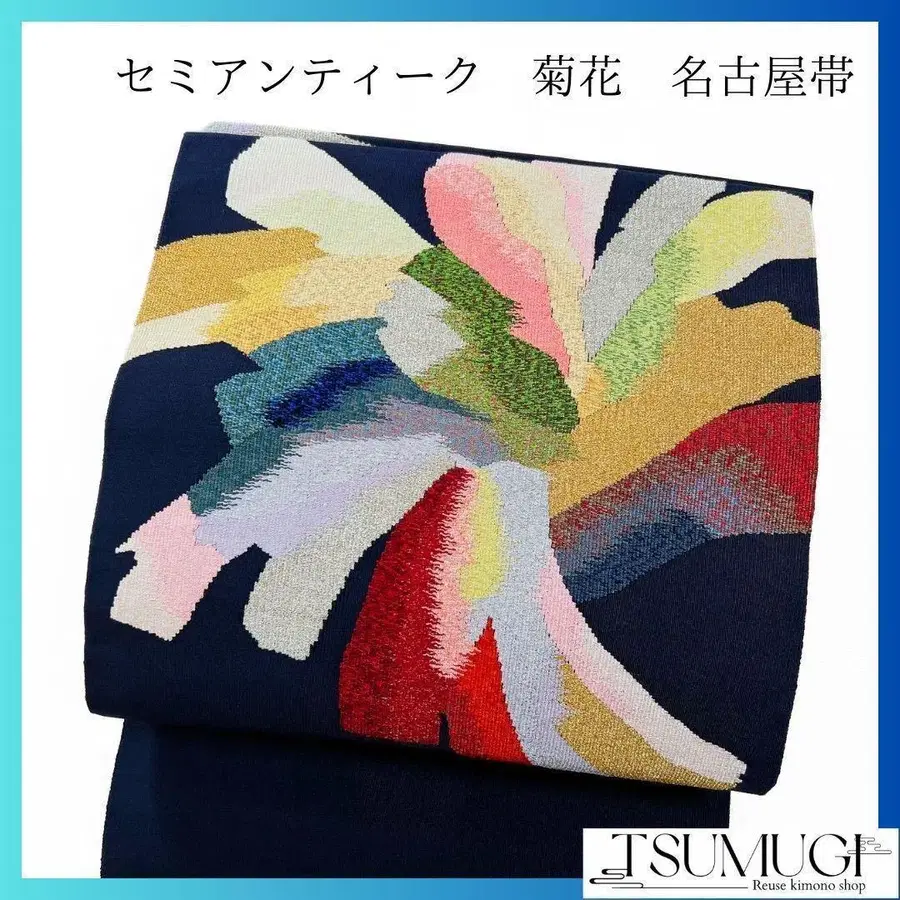 세미 앤티크 직조 국화 네이비 나고야 오비 송엽 짜임 기모노 073w p