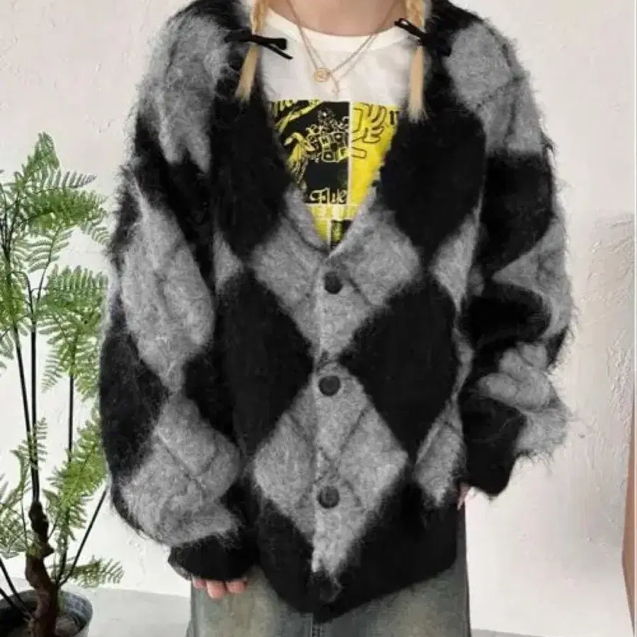 [새상품급] Sedacle 아가일 니트 루즈 가디건 블랙