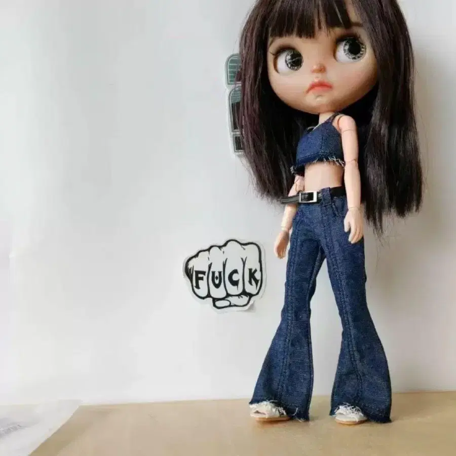 브라이스 데님 크롭탑과 플레어 팬츠 세트