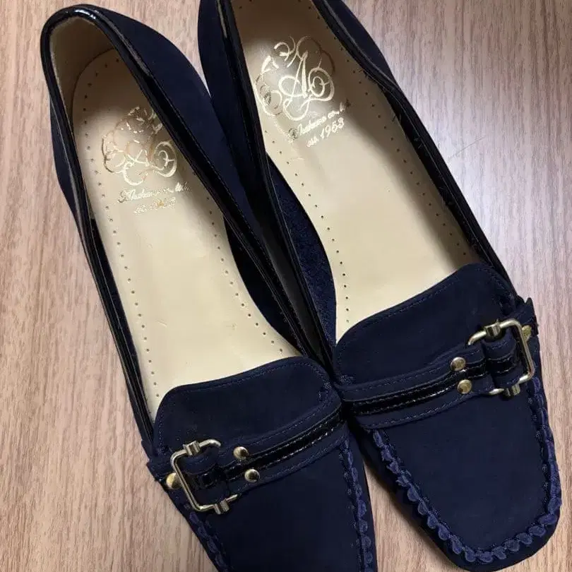 아카쿠라 네이비 스웨이드 버클 플랫 펌프스
