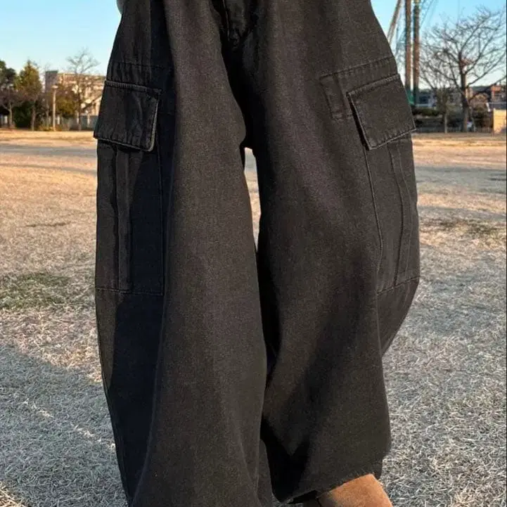 • 구제 와이드 데님 카고 배기 팬츠 블랙