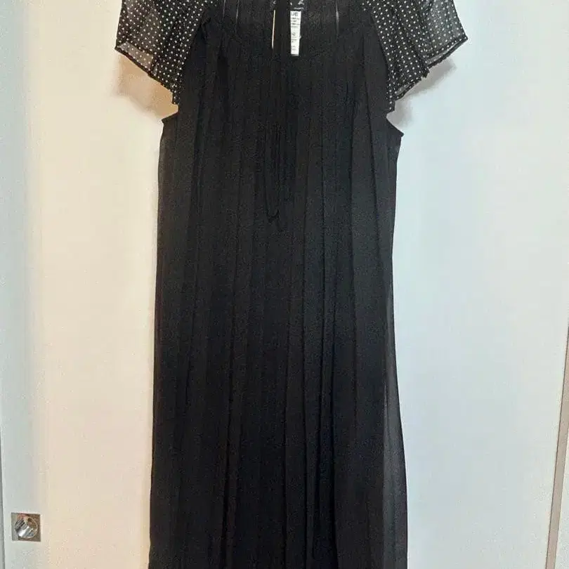 자동 번역되었어요. 원문보기도트 무늬 소매가 특징인 블랙 플리츠 드레스.
