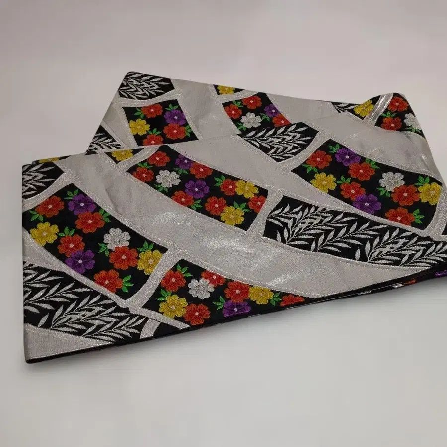 후쿠로 오비 꽃무늬 블랙 베이스 실버 자수