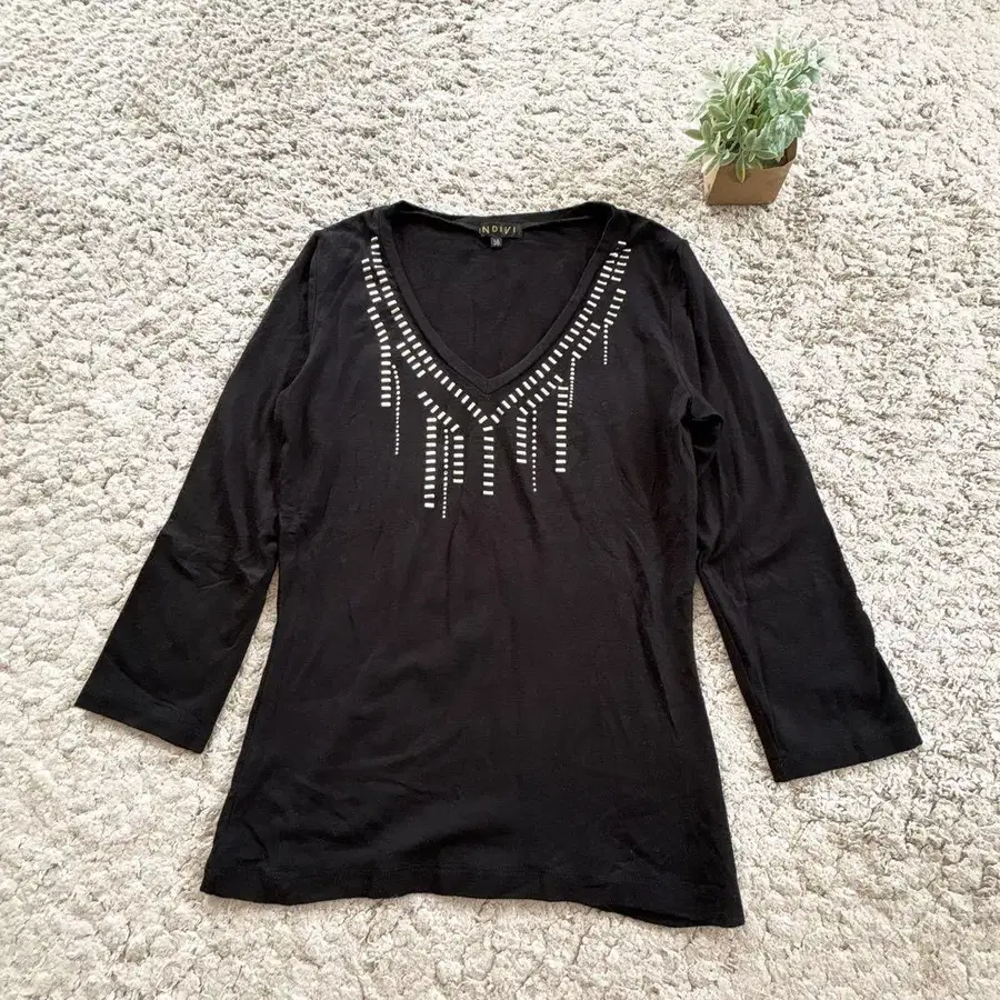 [ INDIVI ] V넥 티셔츠 비쥬 7부 소매 블랙 38 엘레강트
