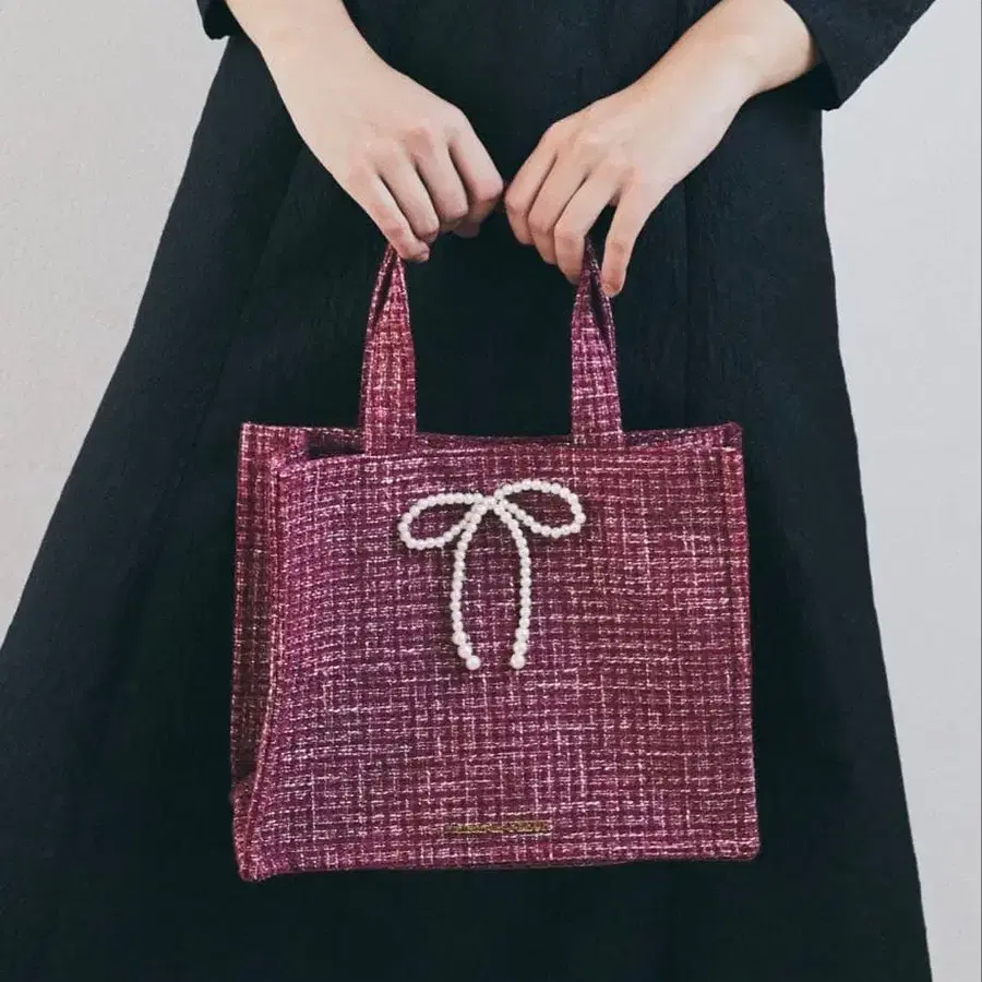 메종 드 플뢰르 핑크 트위드 펄 리본 스퀘어 토트백 빨간색 핸드백