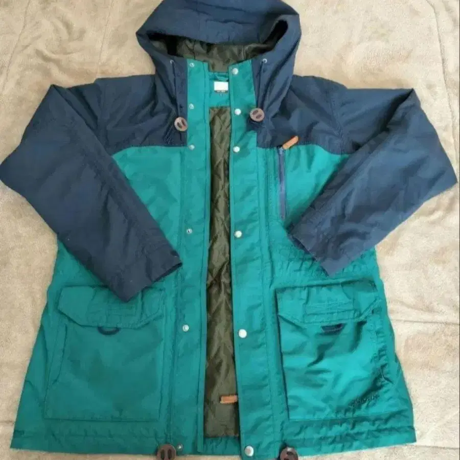 자동 번역되었어요. 원문보기후드 부착된 파랑색과 그린색 마운틴 후드티, L 사이즈, 앞면에 포켓 2개 부착.