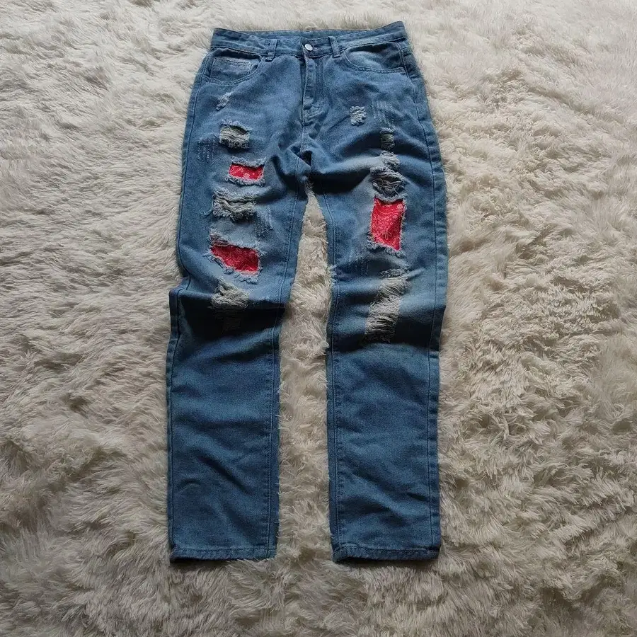 라이트 블루 페이즐리 패치 데미지 데님 팬츠