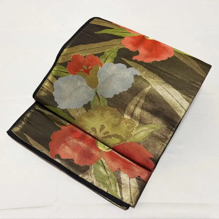 A 꽃 무늬 금실 블랙 베이스 순수 실크 육통 후쿠로 오비 포멀 O13