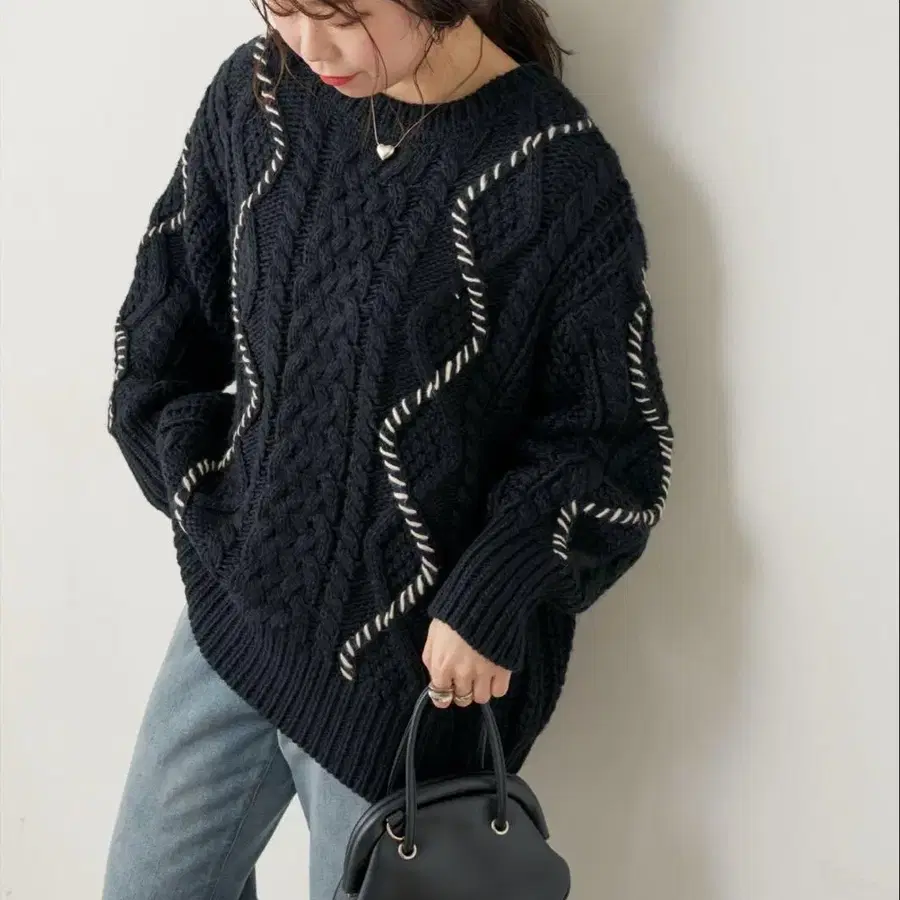 배색 라인 루즈핏 케이블 니트 내추럴 꾸뛰르