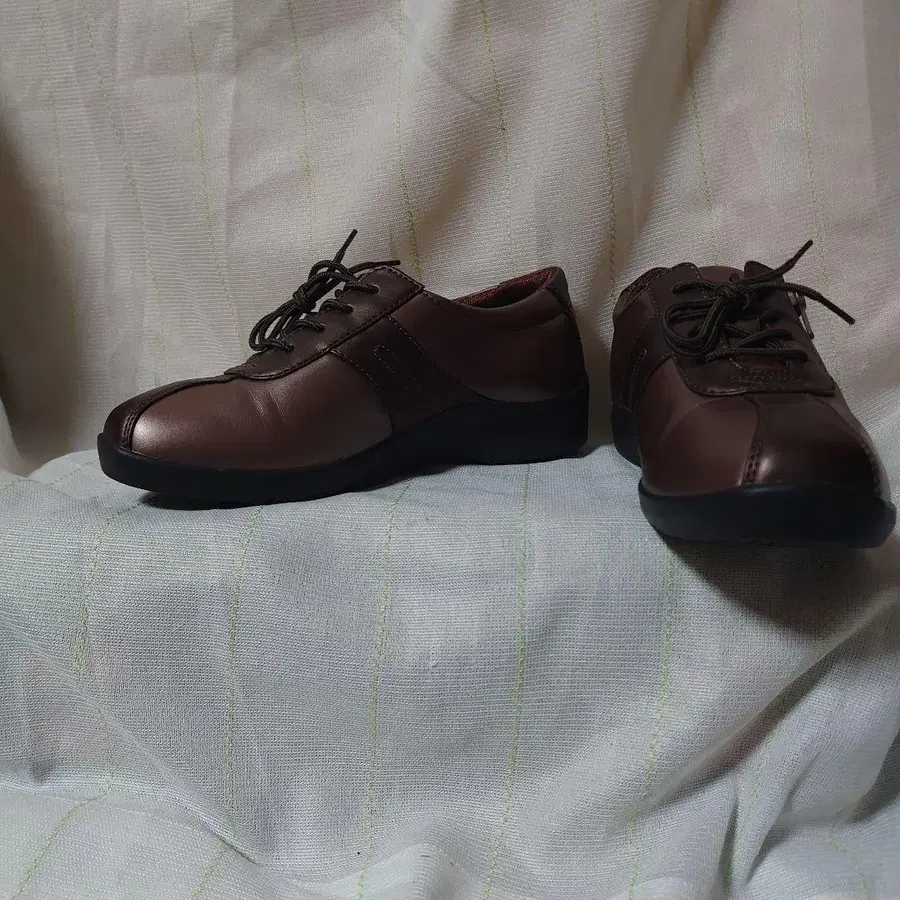 브라운 색상의 레이스업, 사이드 지퍼가 달린 스니커즈, 23.5cm 4E 사이즈로 발볼이 넓고 미끄럼 방지 밑창이 있습니다.