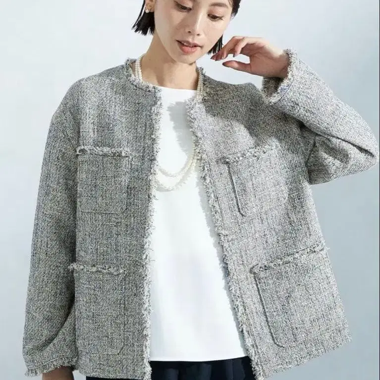 화려한 트위드 라이크 소재 x 프린지가 눈길을 끄는 자켓